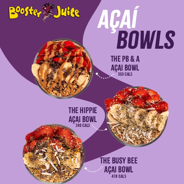 Get ready smoothie lovers, NEW Açai Bowls from Booster Juice are bringing more fruit, more texture, and a bunch of bowl’d flavours to the party. We’ve got new toppings and ingredients to take your smoothie bowl experience to the next level, including bee pollen, cacao nibs, and shredded coconut. Try one, try ‘em all, only at Booster Juice.