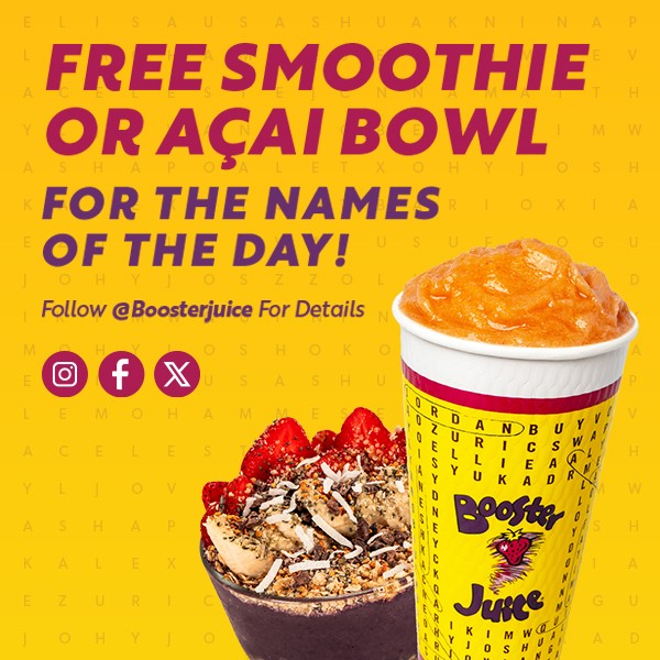 With Booster Juices Names of the Day promotion, you can unlock your main character energy. If your name gets announced on the Booster Rewards App or social media, stop by your local Booster Juice, check in with your Booster Rewards App, and enjoy a FREE Smoothie, or Acai Bowl. Yes, really. It’s that simple.