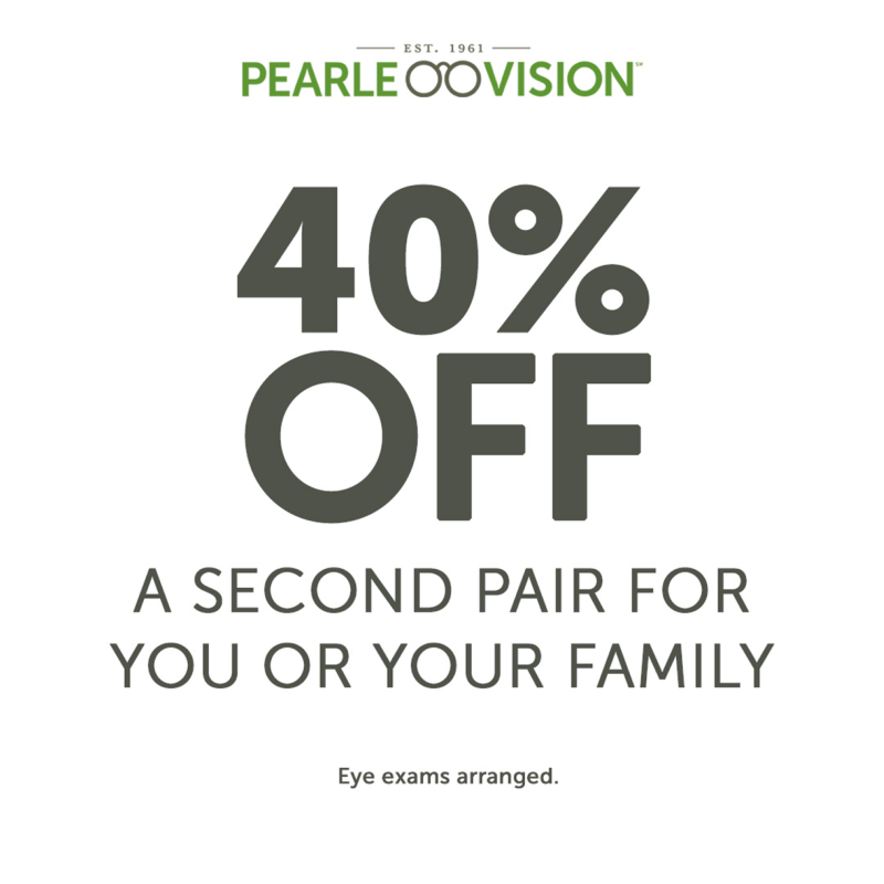 Pearle Vision 40% off Second Pair of glasses for you or a friend or family September 8-November 16 40% off Second Pair of glasses for you or a friend or family member when you buy a complete pair of eyeglasses.