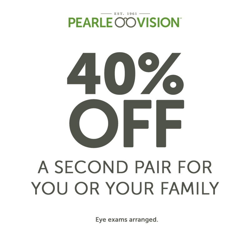 40% off second pair of eyewear for you and your family with the purchase of a first pair. This offer cannot be combined with any other offers. See in store for more details.